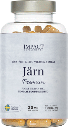 Järn Premium är ett kosttillskott som kombinerar järn, vitamin C och folsyra för att stödja normal blodbildning och främja upptaget av järn i kroppen.