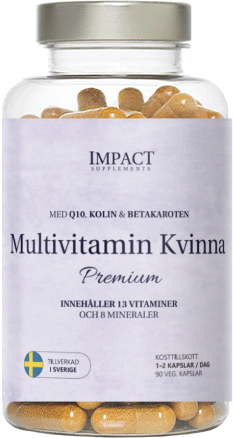 Multivitamin Kvinna Premium är ett kosttillskott som innehåller 13 vitaminer och 8 mineraler, inklusive Q10, kolin och betakaroten, speciellt framtaget för att stödja kvinnors hälsa och välbefinnande.